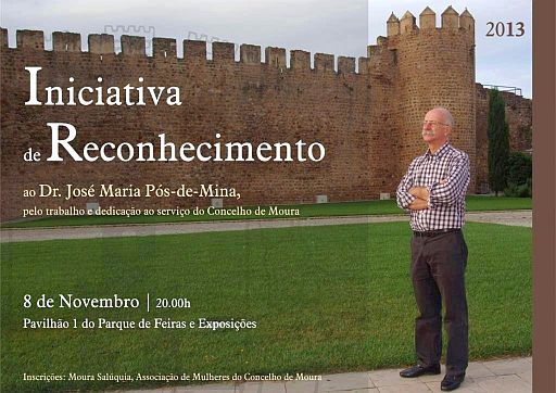 O papel desempenhado por José Maria Pós-de-Mina, enquanto Autarca no Concelho de Moura nos últimos anos, motivou um grupo de cidadãos e colectividades a associarem-se num movimento da sociedade civil para a organização de uma "Iniciativa de Reconhecimento pelo trabalho desempenhado ao serviço da população do concelho de Moura". Esta iniciativa consiste num Jantar, a realizar no próximo dia 8 de Novembro, pelas 20h00, no Pavilhão 1 do Parque Municipal de Feiras e Exposições do concelho de Moura. Da Comissão Organizadora fazem parte a Associação Cultural e Social dos Trabalhadores da Câmara Municipal de Moura, a Associação de Idosos, Reformados e Pensionistas do Concelho de Moura, a Casa do Benfica em Moura, o Grupo de Teatro Lagarto Pintado, Moura Atlético Clube, Moura Salúquia - Associação de Mulheres do Concelho de Moura, Núcleo Sportinguista de Moura e Sociedade Filarmónica União Mourense - "Os Amarelos". As entradas para este jantar poderão ser adquiridas na Associação de Mulheres do Concelho de Moura, bem como junto das restantes entidades que integram a comissão organizadora. |